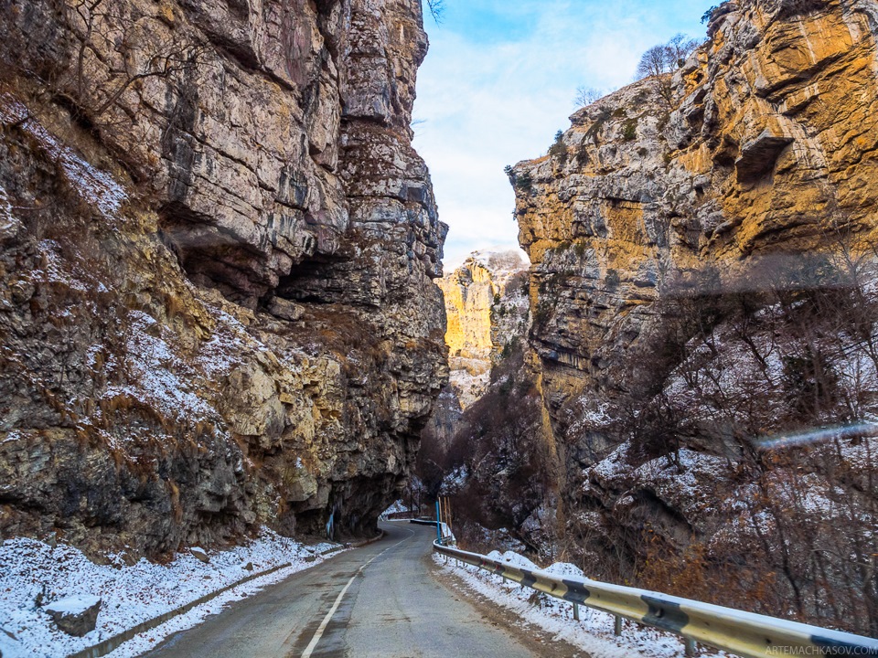 Дорога, проходящая по дну Чегемского ущелья, напоминает змею, ползущую сквозь камни. Когда над головой нависают тысячи тонн камня, о вечном думается легко и непринужденно.