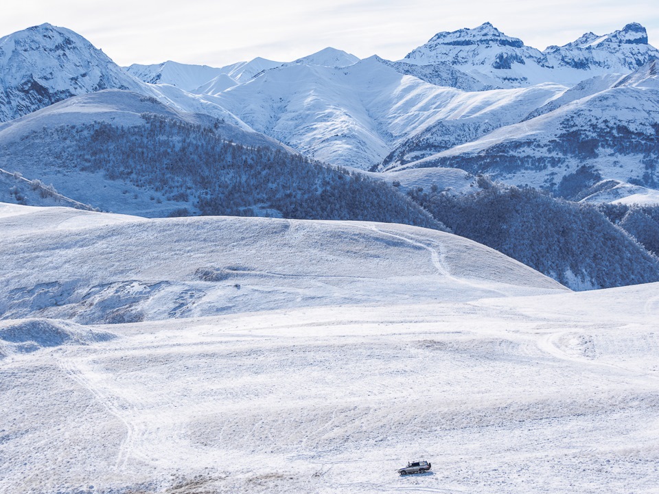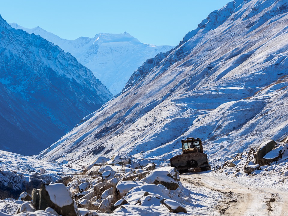 На отметку 4200 метров нас должны были завезти на ратраке, но завести его не смогли — ночью температура была ниже -40. В итоге от станции Мир с высоты 3500 метров мы должны были ехать на снегоходах. По два пассажира на одного угрюмого горца. Но перед этим — в кафе! За занавеской кухни полные улыбчивые женщины в платках огромными половниками наливают из алюминиевой кастрюли наш похожий на глинтвейн welcome drink, к которому в районе барной стойке улыбчивый седовласый мужчина добавляет до верха стакана "Лезгинки". Выпив по стаканчику, мы поехали.