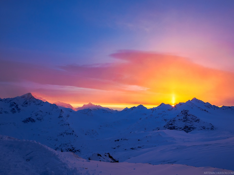 Видимость появилась, а вместе с ней — шикарная отратраченная трасса. Закладывая очередную дугу, я почувствовал знакомую вибрацию. Крепление открутилось! Кое-как доковыляв до станции канатки на высоте 3800 м, я ввалился внутрь, попросив у встреченного мной мужчины инструменты. Минут десять голыми руками тот перебирал смерзшиеся железки в инструментальной сумке своего снегохода. Когда руки уже побелели, где-то на дне нашлась крестовая отвертка со сломанной ручкой. Кое-как закрутив крепления, у которых оказалось только по два "живых" болта вместо четырех, я доехал до Мира. Больше кататься в этот день мне не хотелось, а отморозок Миха поехал до низа на доске уже после захода солнца, который я наблюдал с высоты 3500 метров.