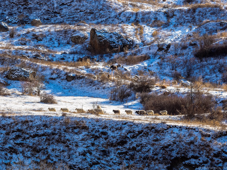 Еще немного — и мы в очередном ущелье, а это значит, что где-то рядом снова пасутся овцы, снова шумит внизу бурный поток. С отвесных скал снова падают камешки, хорошо, не на машину…