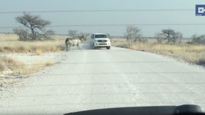В начале видео носорог ещё вполне мирно оглядывает машину, но уже через секунду опускает рог, чтобы пойти на штурм.