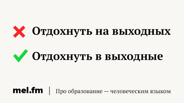 Если вы на выходных не успеваете отдохнуть, попробуйте это делать в выходные. Мы не шутим: разница есть! «На выходных» — это разговорно-просторечный вариант, недопустимый в литературной речи. Нормативным и грамотным вариантом считается «в выходные». Кто знает — может, если мы даже отдыхать будем грамотнее, будет больше пользы и сил в понедельник. Тут же скажем про пару «на каникулах» и «в каникулы»: у них чёткой градации нет, и общеупотребительным, как ни странно, считается вариант «на каникулах», а вместо «каникул» рекомендуют говорить «во время каникул». Так-то! Теперь постарайтесь не запутаться.