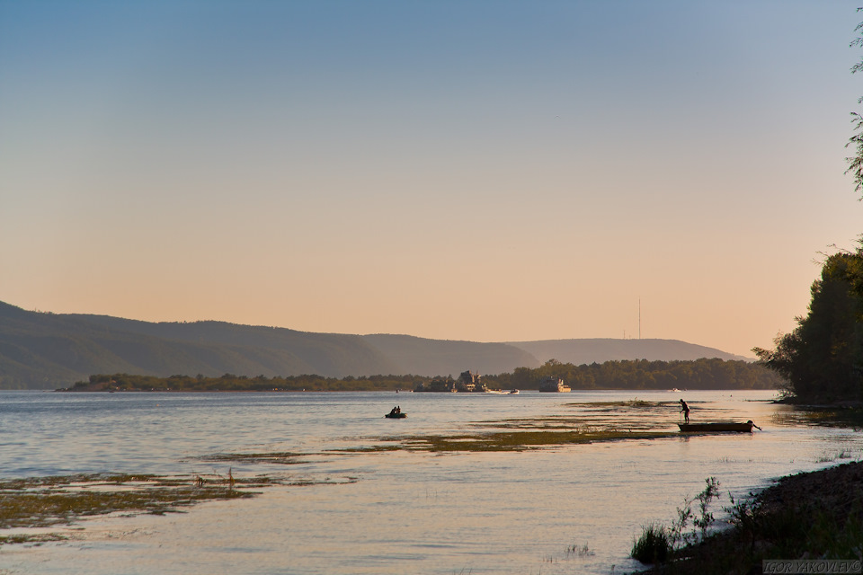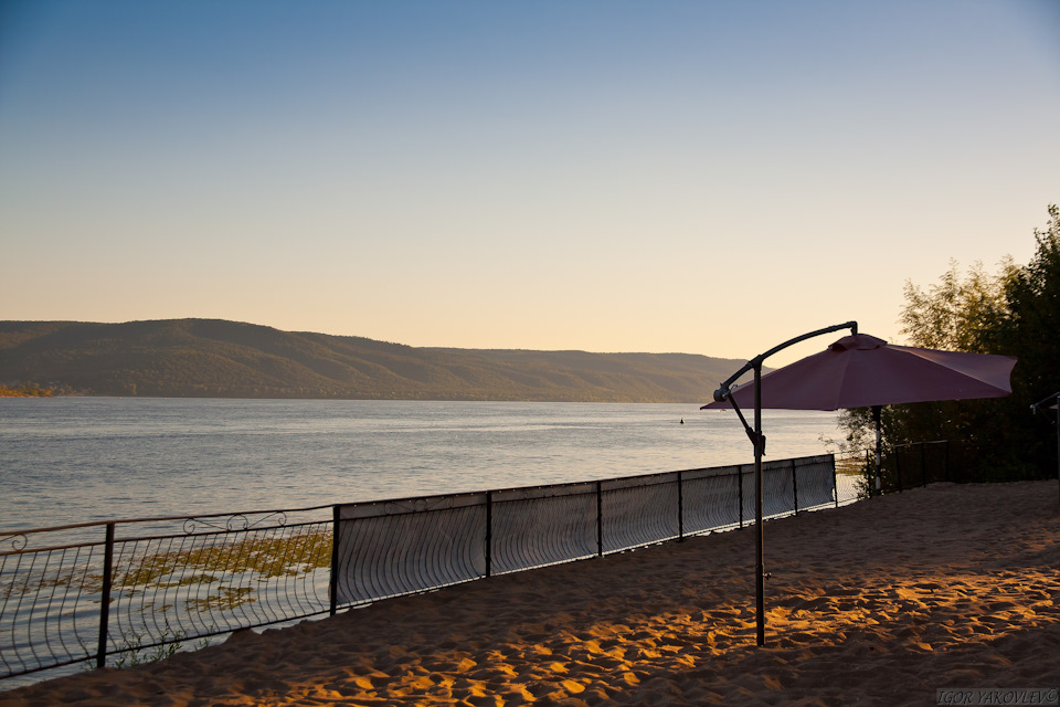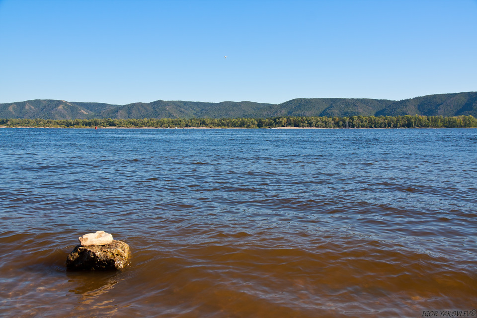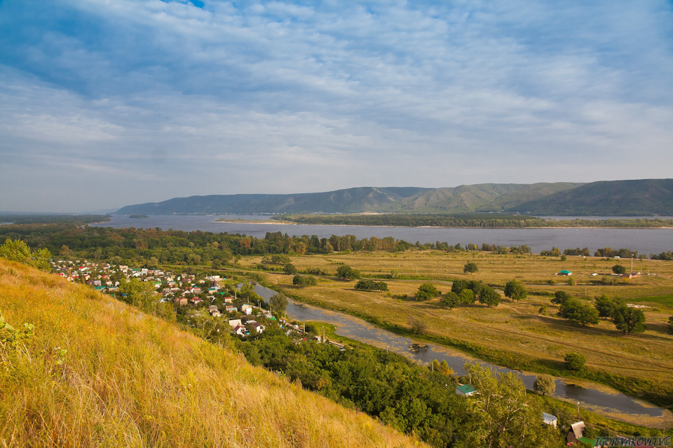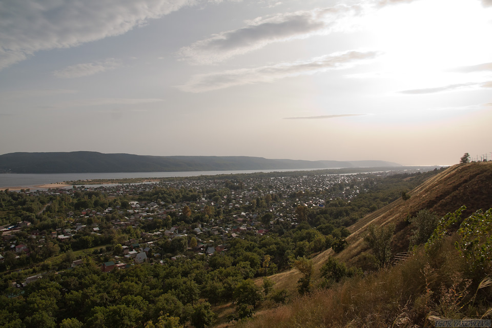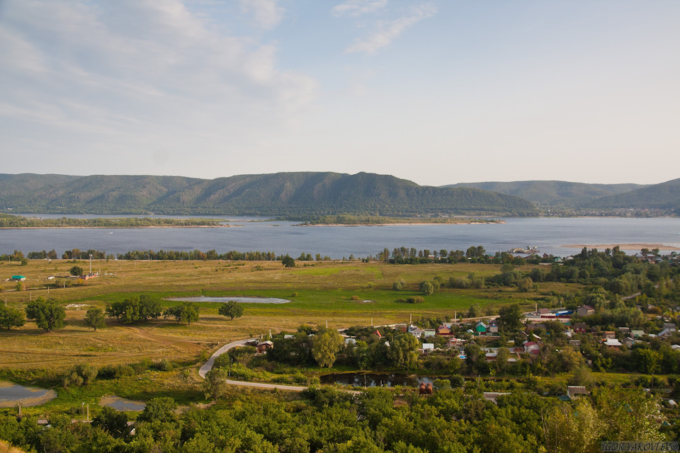 … а с другой стороны тянется река Волга, и виднеются Жигулевские горы национального парка – заповедника Самарская Лука.