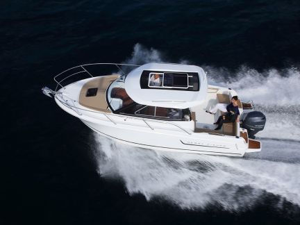 5. Кокпит: мини-холодильник, гриль стационарный, мини-камбуз, диван центральный со столом на 6 мест, отдельно стоящие диваны на 1 и 2 места, 6.1 система Alpine Marine с Bluetooth, кормовые лежаки на 3-4 места, отопитель, тент, гараж для лодки для подхода к берегам, кормовой душ с горячей водой для мытья после купания.
