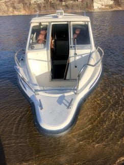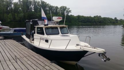 Тентованная палуба, с выходом на кормовую площадку для купания, прекрасно разместит гостей для дружеского застолья. Мебелированная кожанными диванами уютная кают-компания снабжена кондиционером, TV и DVD. Небольшая носовая палуба для загорания или дружеской беседы. Камбуз с газовой плитой, СВЧ-печью, чайником, холодильником и горячьей водой. Гальюн с душем. Музкальный центр, мангал. Конструкция катера очень удобна для причаливания и спуска с носа на берег. Стоимость аренды: пн-чт 3 000 руб/час, пт-вс 3 500 руб/час. Тариф дневной с 10:00 до 20:00: пн.-чт - 20000,0руб., пт.-вс - 25000,0руб. Минимальный заказ 4 часа. Подход к пристани 1 000 руб.