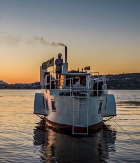 Современный колёсный пароход премиум класса. На борту имеется всё необходимое для отдыха: газовая плита, холодильник, музыка,мангал и многое другое. На борту данного парохода есть баня, которая предлогается как доп. услуга.