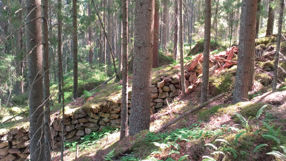 Таких каменных гряд тут несколько. Пишут, что это были заготовки гранита для отправки в Петербург. Из них там делали брусчатку. До социальных катаклизмов начала прошлого века весь гранит вывезти не успели. Так сложенные ровными рядами камни и лежат, настолько надежно скрытые лесом, что при немаленьком размере сооружений, мы их не сразу отыскали.