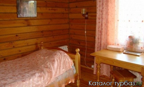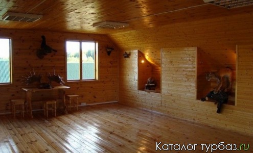 Предлагается деревянный коттедж с отдельными номерами. Помещения в коттедже обшиты деревом, комнаты украшены чучелами животных и птиц.