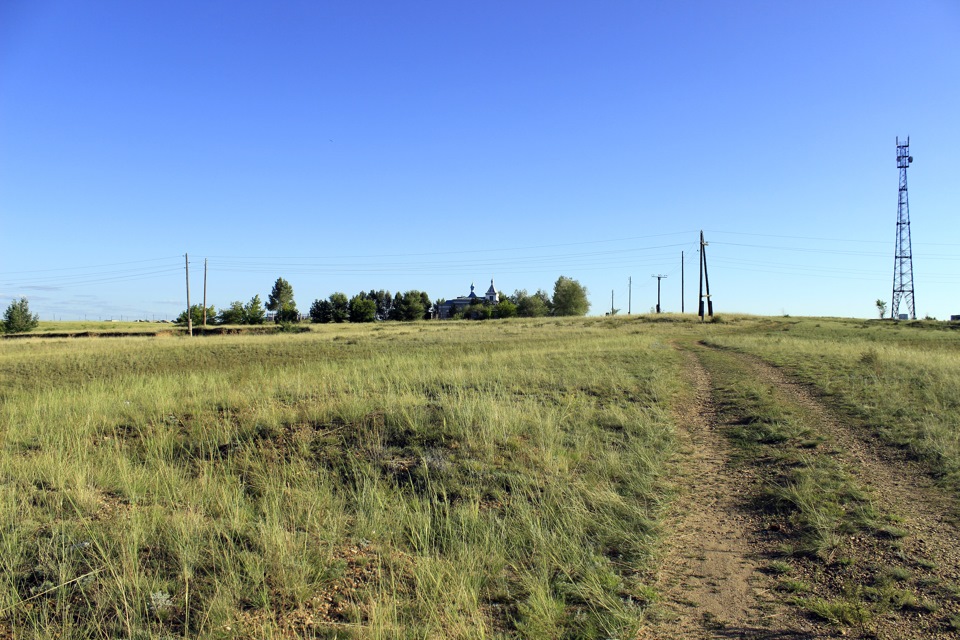 Зато совершенно случайно наткнулись на местную церквушку или скорее часовню. Стоит она в стороне от самого поселка, дорога к ней — лишь накатанная колея через степь, да и та вся заросла травой.