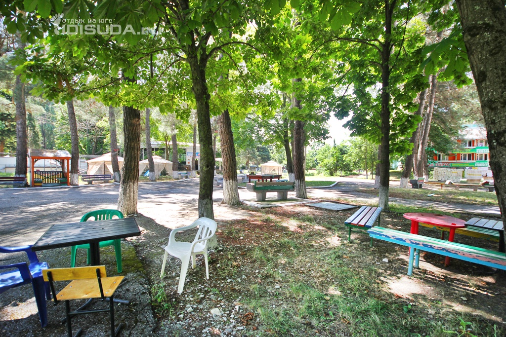 Просторная территория базы отдыха предназначена для безмятежного времяпровождения, сидя под деревом на зеленой лужайке. Для любителей активного отдыха - волейбольная площадка, для любителей мяса - мангал, а для детей - детская площадка с качелями.