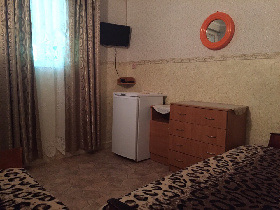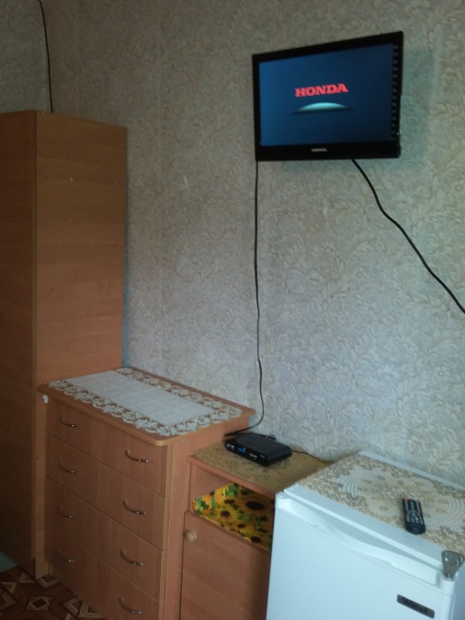 В номере диван двухместный и кровать односпальная, телевизор и холодильник,комод, тумбочка. ( Номер рассчитан как на троих так и на двоих человек). Санузел вне номера.