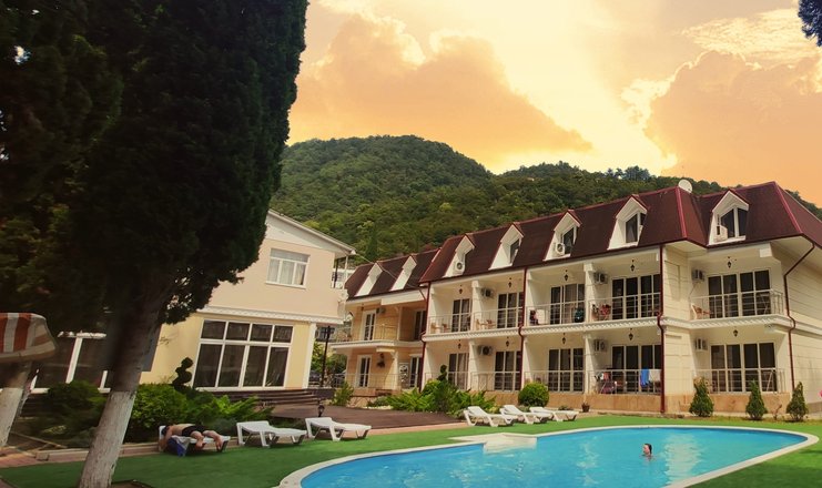 Отдыхаем с 16.08. 2021. Территория небольшая, но приятная для отдыха:зелень, бассейн, качели, детский городок с батутом. Ресторан на 1м этаже : комплексные завтраки 250руб. (4 варианта) вкусные, комплексные обеды 350 руб. не съедобные (. В пешей доступности монастырь, пещеры, парк, водопад-это очень удобно. Номер 2хместный с окном на улицу Царская аллея. До 23.00 уснуть невозможно совсем, тк грохочет музыка из кафе напротив, ровно в 23.00 музыка на улице замолкает. Номера на 3+. Нехватает чистоты в уборке, шкафа с полками для одежды (маленький шкаф с вешалками), полочки около умывальной раковины. Пляж- рядом впадает горная река поэтому нужно найти место, где нет ледяных потоков. Ну а в целом для Абхазии неплохо.