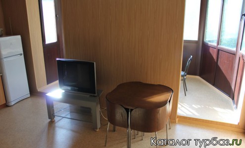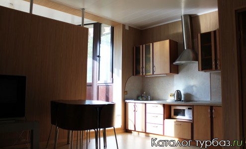 В центральной части на втором этаже находятся апартаменты, в которых есть две спальни с 2 - спальными кроватями, 2 санузла (душ и туалет), совмещенная кухня с гостиной, остекленный балкон. На кухне имеется бытовая техника, холодильник и набор необходимой посуды. Гостиная оборудована мягкой мебелью, телевизором с DVD и караоке, шкафами. Прямо на выходе из апартаментов находится выход на открытый балкон.