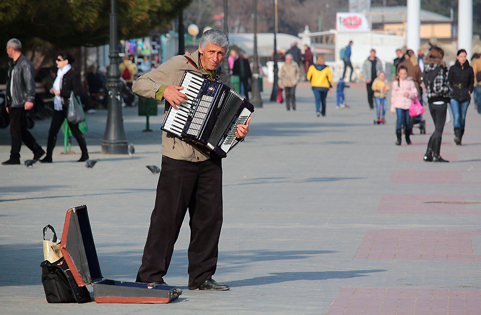 Возле моря просторно и малолюдно. Одинокий, но улыбчивый музыкант на всю Набережную играет на аккордеоне мелодии военных лет. А вокруг него бегают дети или катаются на машинках, которые можно взять на прокат возле знаменитой Ротонды.