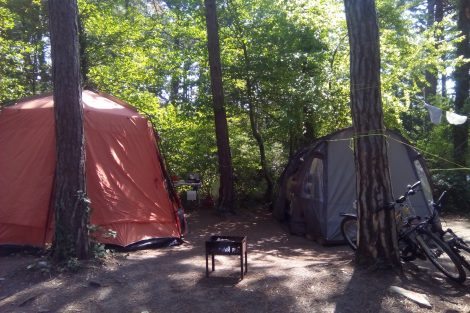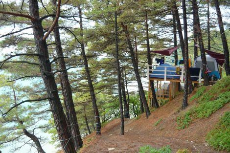 Сосновый Рай имеет 6 полян для стоянки: 2 с большими расстояниями между деревьями, 2 с небольшим расстоянием между деревьев, 1 на удалении от всех на 3 палатки и 1 находится прям на обрыве с видом на Черное море. По большому счету все равно, где стоять, но с видом на море симпатичнее. Не так давно сделали 4 крутые террасы и за счет этого появилось еще 4 места под палатку. Кстати, террасы почти всегда забронированы, козырные места.