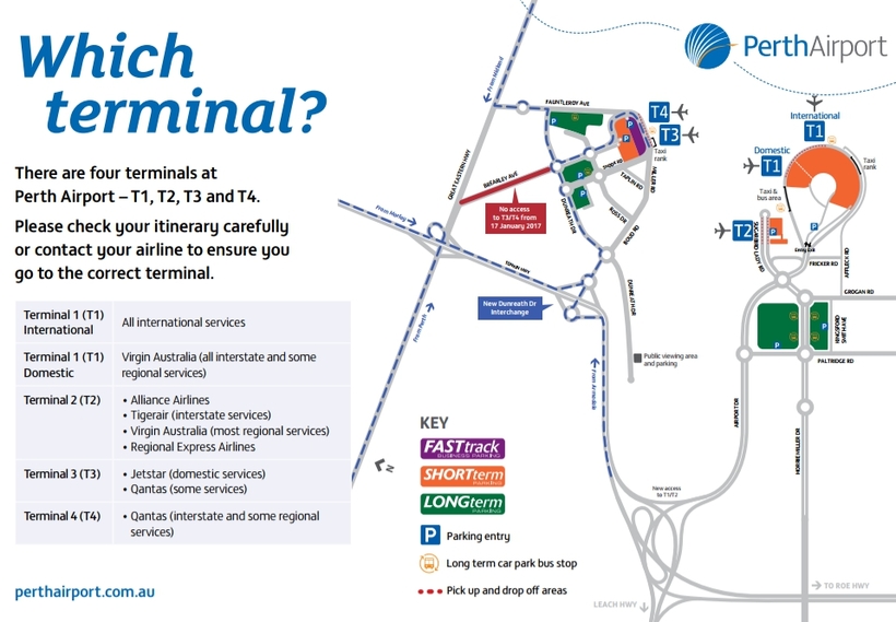 Аэропорт Перта состоит из четырех терминалов: Т1, T2, T3, T4. Все международные рейсы прибывают в терминал Т1. Если вы летите внутренним рейсом, чтобы узнать свой терминал, внимательно читайте информацию на билете, либо обратитесь в авиакомпанию.