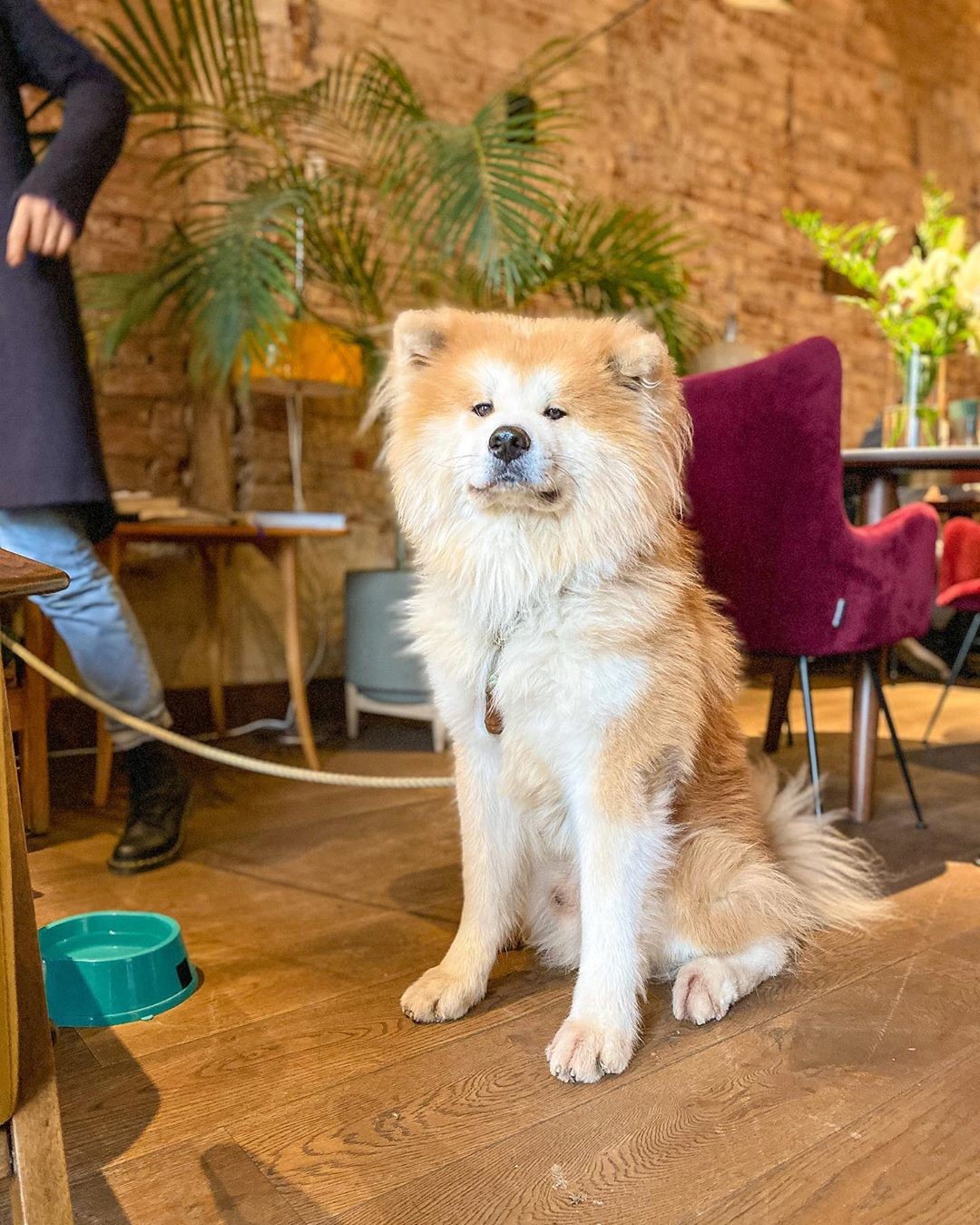 Городское кафе с обширным вегетарианским меню радушно принимает как людей, так и собачек. Для питомцев есть ограничения: весить не больше пяти килограммов и сидеть с хозяевами только на первом этаже.
