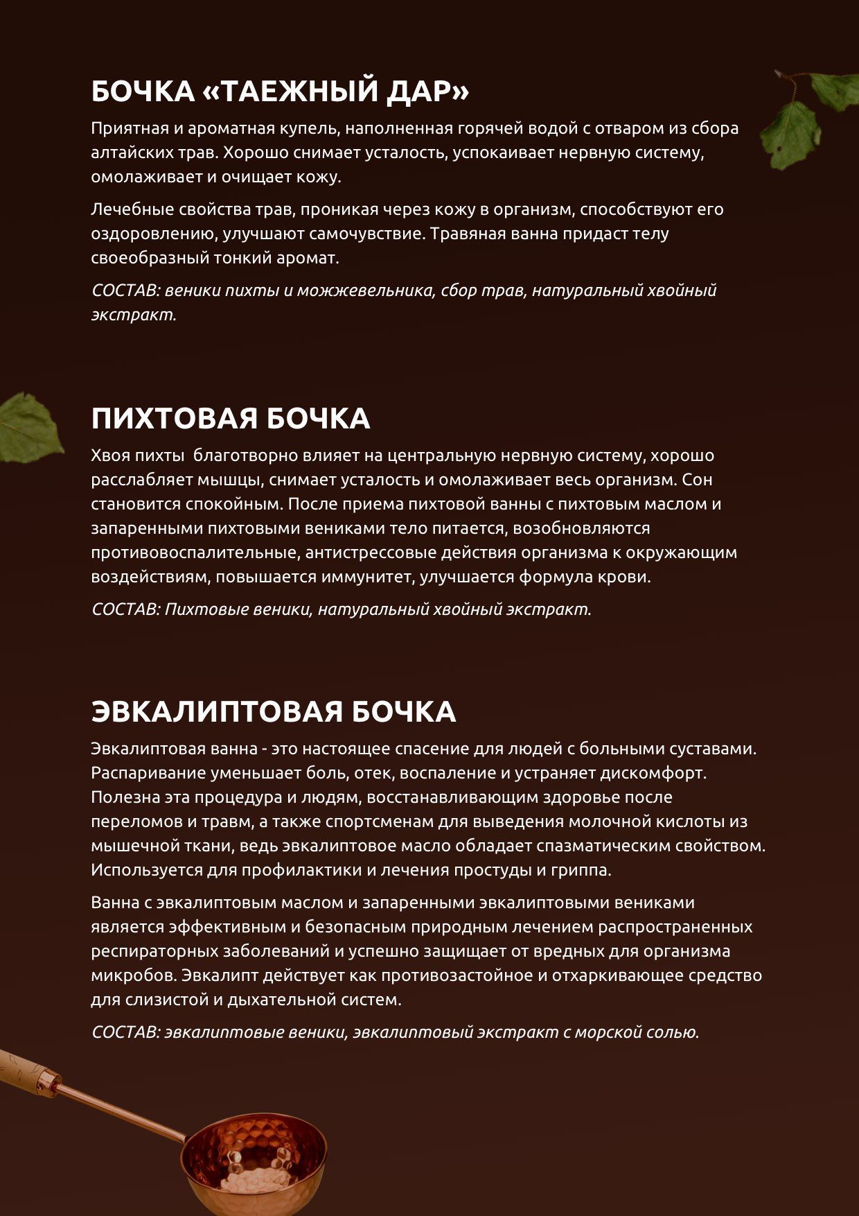 Ванна очистит и омолодит кожу, снимет усталость, расслабит и успокоит. Состав: веники можжевеловый и пихтовый, травяной сбор хвойный экстракт