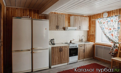 Все гостевые коттеджи оснащены кухнями для самостоятельного приготовления пищи. Возле домов расположены площадки с мангалами, где можно приготовить мясо, рыбу или овощи на углях.