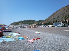 Плюсы: рядом с кромкой воды, чистое море, галечный пляж, море чистое, малолюдно, деревья, дающие тень, есть.