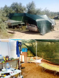 Судя по отзывам все на западный крым ломанулись, где нет гор и потоков с них грязевых …а с тенью там не очень… А посему берем палатку, шатер, палатку туалет, тент-сеточку, и ну его, эти кемпинги… Еще брали в прошлом году солнечную панельку 100 вт с контроллером — тянет авто холодильник и гаджеты.