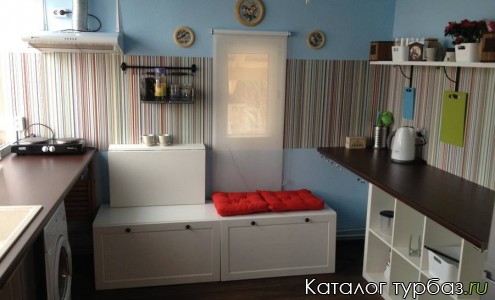 Кухня (плита с духовкой, микроволновая печь, чайник, посуда).