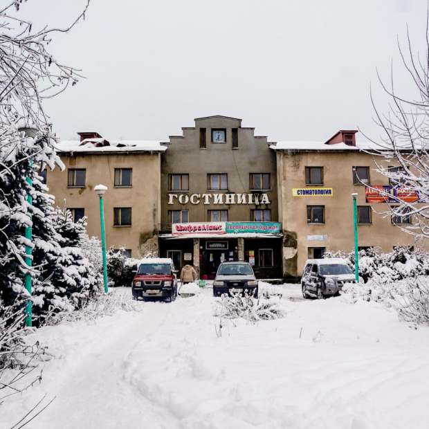 3. Вот, собственно, и гостиница. С, наверное, ещё советской вывеской. Здание оказалось весьма необычной для этих мест архитектуры: если бы я не знал, где это, то подумал бы на межвоенный функционализм в какой-нибудь Сортавале или Калининградской области.