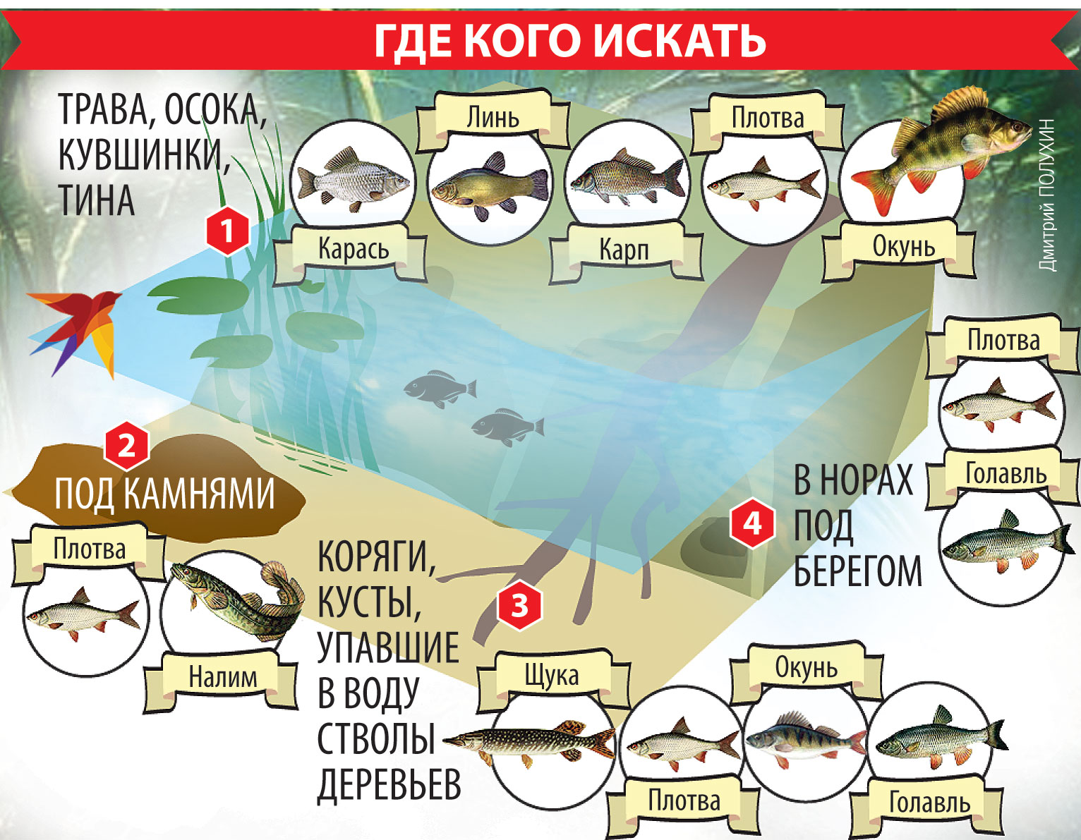 У каждого вида рыбы свои места обитания. В осоке любят кочумать плотва и окунь. В корягах - голавль. Порываев ходит, шаря в воде.