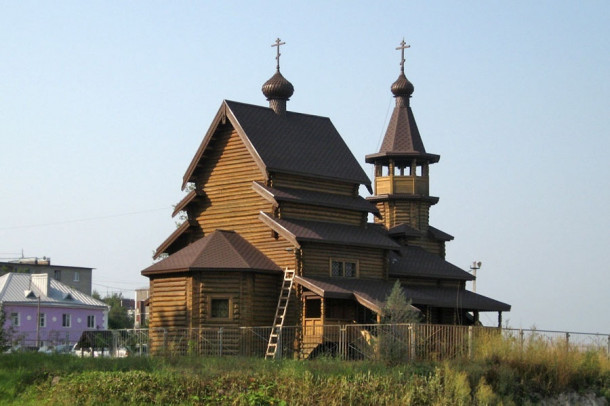 Возле дороги, ведущей к мосту - новодельная деревянная церковь.![]()
