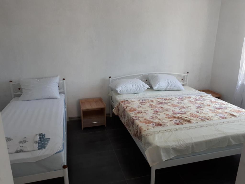 До моря 150 метров. 4х местные номера с кондиционером, телевизором, душ/туалет и своей кухней. Столики на улице, во дворе есть карусель для детей.