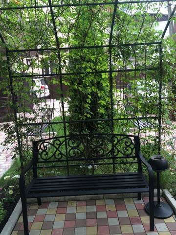 Во дворе беседки для приятного времяпровождения, лавочки окруженные садовыми скульптурами, зеленью и красиво цветущими растениями, мангал для желающих отведать самостоятельно приготовленные блюда на угле.