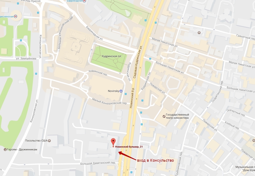 Адрес Консульства: Москва, Новинский бульвар, 21 (метро «Краснопресненская» / «Баррикадная»).
