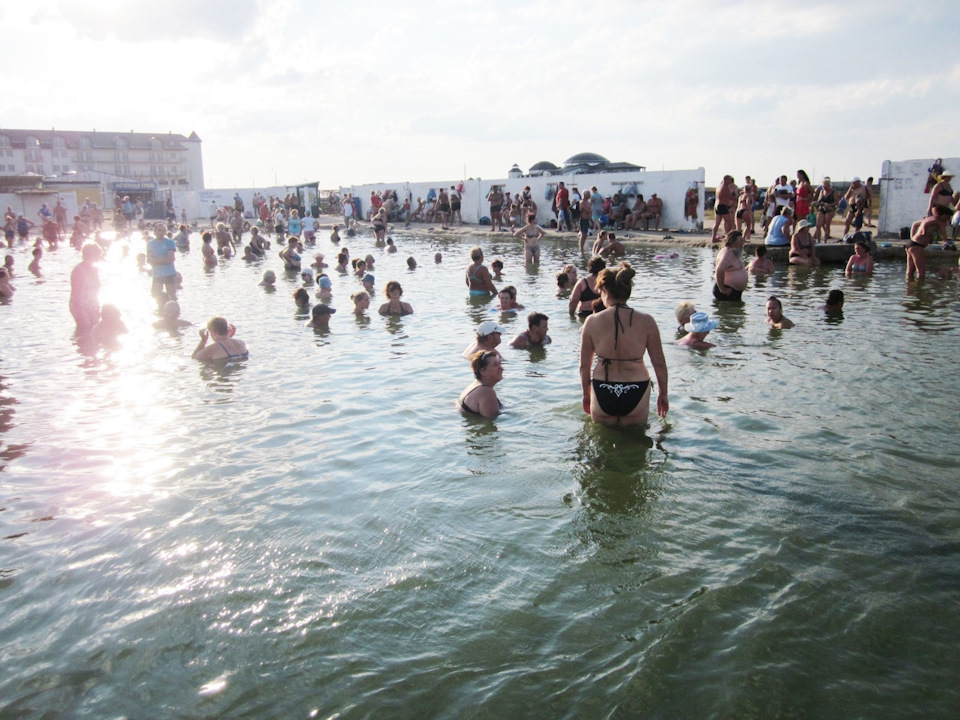 В небольшом курортном городке Счастливцево, который вытянулся вдоль береговых линий Азовского моря и Сиваша, на одном квадратном километре расположен и Радоновый горячий источник и Солёное озеро.