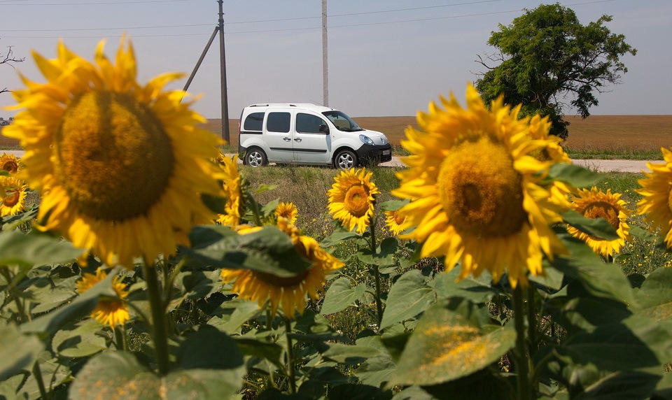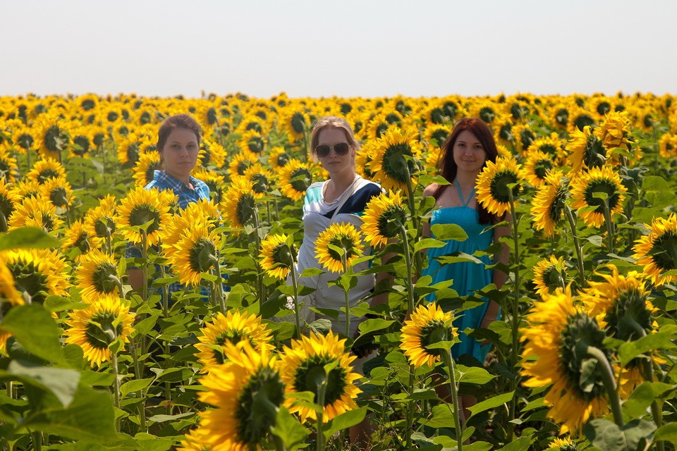 По полям полно ржи, которую убирают комбайны, а также поля подсолнухов. На одном поле с подсолнухами остановились, чтобы размяться, ну и естественно сфотографировать бегемота и пассажиров)))