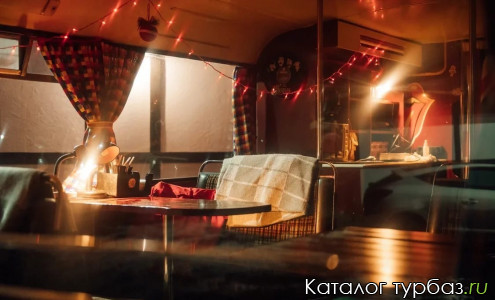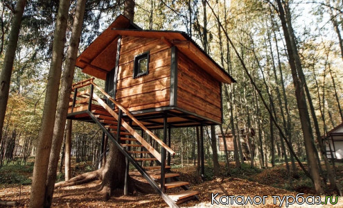 Домик на дереве (2 места): 2-спальная кровать (две 1-спальных кровати), стол, стулья, постельные принадлежности, СВЧ-печь, чайник, обогреватель, терраса. При размещении с детьми предоставляется дополнительная кровать. На территории: санблок с душем и туалетом.