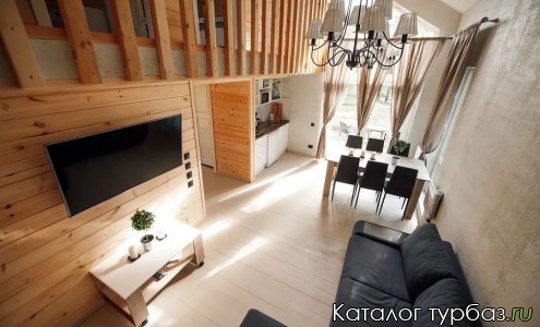 Коттедж «Голицын» (8 мест): два этажа, две 2-спальных кровати, две 1-спальных кровати, раскладной диван, стол, стулья, постельные принадлежности, СВЧ-печь, чайник, плита, холодильник, телевизор, обогреватель, терраса, туалет, душ. При размещении с детьми предоставляется дополнительная кровать.