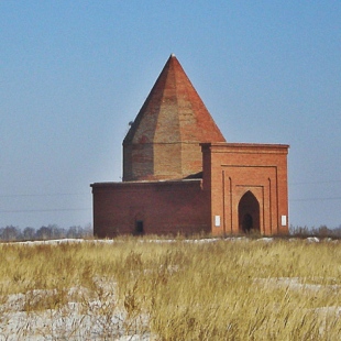 Одиноко стоящий среди степи мавзолей с шатровым куполом хорошо виден и с трассы на Николаевку, и с железной дороги, хотя от посёлка до него около четырёх километров. Зрелище это для России, прямо скажем, нетипичное - подобное есть ещё разве что под Уфой (Чишмы и Верхние Термы). Вообще, памятников древнетатараской архитектуры в России остались единицы - ещё они есть в Болгаре (минарет, три мавзолея, три палаты, руины мечети), Касимове (минарет), Елабуге (руины мечети), а может и где-то ещё - уничтожение покорённой Орды я считаю одной из самых неприглядных страниц русской истории. За 200 лет гонений (которые кончились лишь при Екатерине II), когда татарам запрещалось строить минареты, каменные мечети и мавзолеи, была почти полностью уничтожена архитектура целого государства - сотни мечетей, мавзолеев, крепостей, дворцов были или разрушены целенаправленно, или разобраны на строительный камень. Теоретически в Поволжье, Предкавказье и на Южном Урале всяких построек 13-15 веков должно было быть уж точно не меньше, чем древнерусских церквей в Средней России и Украине. но осталось лишь то, что осталось.