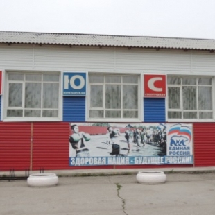 На самой администрации красуется совершенно советский лозунг - только на голубом, а не красном, фоне: