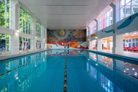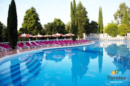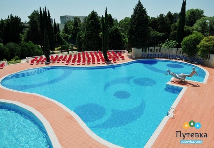 На территории санатория для гостей работают 2 бассейна с подогреваемой морской водой. Бассейн под открытым небом работает сезонно, с 01 мая по 15 октября, крытый бассейн работает с 15 октября по 01 мая. Территории у бассейнов оборудованы шезлонгами и душевыми кабинками.