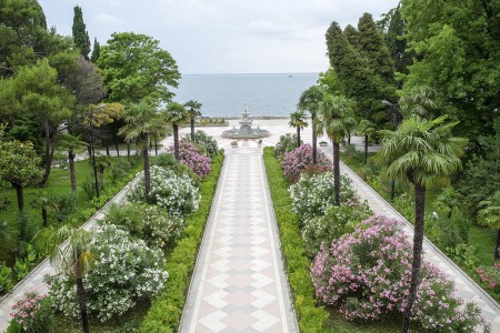Уникальный «Реликтовый парк» санатория: это хвойные деревья, пальмы, плодоносные оливы, привезенные с Италии, редкие цветущие кустарники.