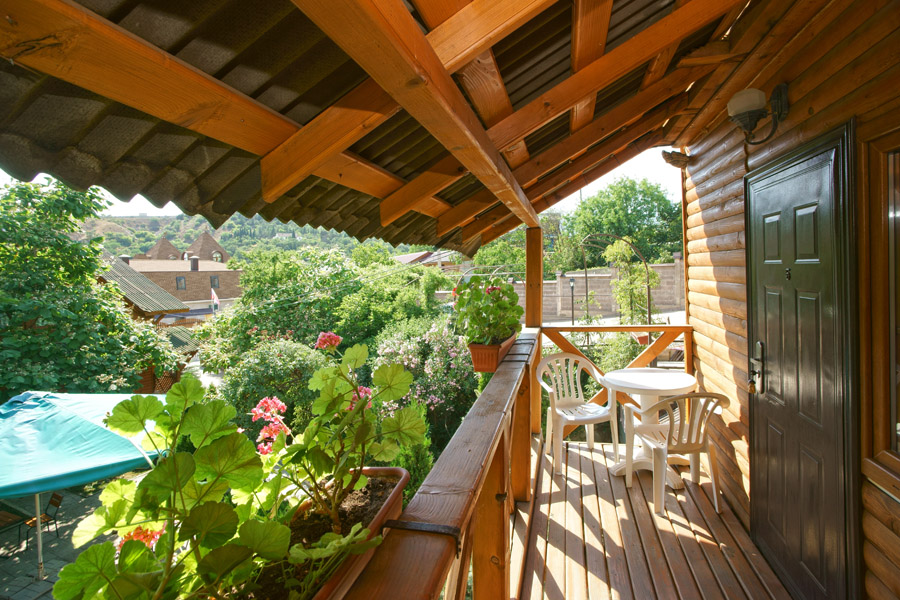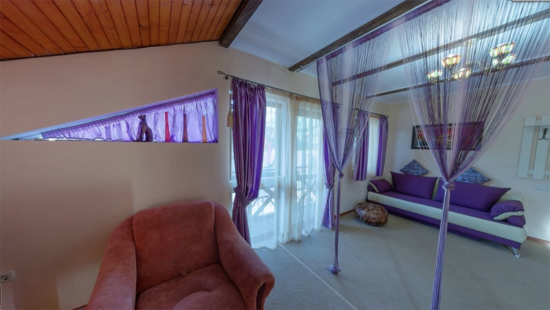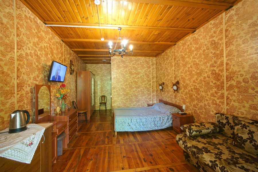 Гостевой дом расположен в престижном санаторном районе города, в 6-8 минутах ходьбы до моря, по тенистой аллее. Вблизи много санаториев, где возможно пройти процедуры связанные с лечением органов дыхания и кровообращения. Рядом спортивная база с теннисными кортами, футбольными и баскетбольными полями, и залом тренажеров. В двухстах метрах расположен концертный зал, где периодически выступают известные артисты. Дорога к морю и к набережной, это прохладная тенистая аллея, где летом размещаются торговые палатки с пляжными принадлежностями,сувенирами и фруктами. Рядом парк детских аттракционов, приморский парк, дельфинарий, множество кафе, продуктовых магазинов, ларьков с фруктами. Не далеко Центральный продуктовый рынок и не дорогие столовые. В окрестностях города много природных экскурсионных мест. Экскурсионные маршруты по Крыму отправляются из пунктов, расположенных в непосредственной близости от гостевого дома. Все номера в доме снабжены своей мини-кухней (с набором посуды и плитой), душем, туалетом, кабельным TV, WI-FI, кондиционером, подогревом воды. В номерах имеется балкон или терраса, где гости могут отдыхать на свежем воздухе Имеется стоянка для легковых автомашин и летняя беседка общего пользования. Стоянка вмещает 5 легковых авто. Преимущество пользования стоянкой имеют гости проживающие в больших семейных номерах. Спальные места в номерах представлены двухспальными кроватями. Дополнительные места - раздвижной диван-кровать книжка в больших семейных номерах, кресло- кровать в семейных номерах с балконом. Допускается размещение 2х взрослых и 2х детей в большом семейном номере и 2х взрослых и 1 ребенка в семейном номере с балконом. Дом под постоянным присмотром хозяев. Все возникающие неудобства для гостей устраняются в кратчайшие сроки. В любое время можно получить необходимую консультацию по бытовым вопросам. За не значительную оплату, можно воспользоваться стиральным автоматом. Дополнительная уборка платная. В гостевом доме принимают только спокойных семейных отдыхающих, которые ценят не только свой отдых, но и отдых окружающих их соседей. По правилам проживания недопустимо шумное поведение после 23:00.
