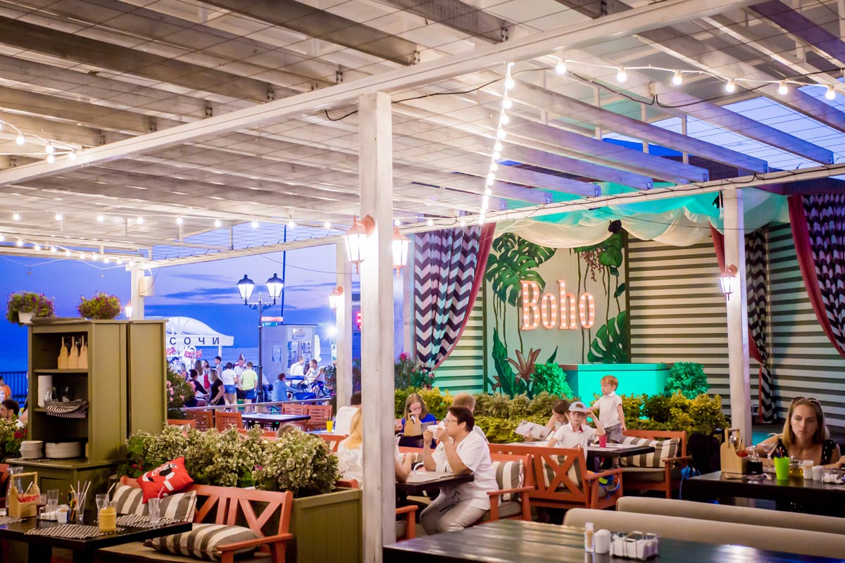 «Бохо» — уютный ресторан на Олимпийской набережной, где подают блюда высокой кухни: шашлык из индейки, речную форель на гриле, треску с вафлей из шпината под икорным соусом, императорские устрицы и то, от чего не сможет отказаться настоящий гурман. Приятная живая музыка, вид на море, откуда открывается неповторимый закат, и качественное обслуживание дополняют и без того красивую атмосферу. Посещение этого места — гастрономический праздник по демократичным ценам.