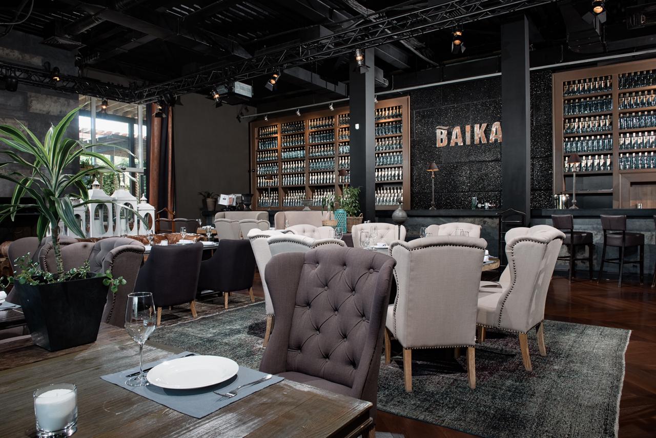 Интерьер ресторана «Байкал» сделан в эклектичном стиле, гармонично соединяющим в себе винтаж, кантри и модерн. В залах много свободного пространства, а с веранды открывается восхитительный вид на Олимпийский парк, где в вечернее время можно наблюдать за знаменитыми поющими фонтанами. Хорошая музыка, предусмотрительные официанты и умелые повара создают атмосферу уюта и комфорта. В меню можно найти низкокалорийную еду из овощей, рыбы и морепродуктов, горячие мясные и рыбные блюда, разнообразные пасты и мучные изделия, японскую кухню, десерты, салаты и закуски, а также коктейли, безалкогольные и алкогольные напитки, чай, кофе.