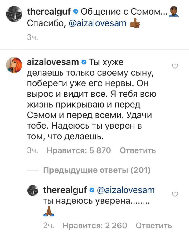 После расставания отношения не стали более спокойными: экс-муж и жена то жестко высказывались друг о друге в интервью, то зачитывали целые рэп-послания. В 2017-м Айза записала "дисс на Гуфа" под названием Supreme — в ответ на его выпады в соцсетях в адрес ее нового бойфренда: