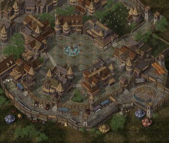This city benefits of two outer walls outside of which caravan tents and merchants are trading. Inside the walls is a small city with its temple, its inn, its townhouse, several houses and a graveyard are protected.