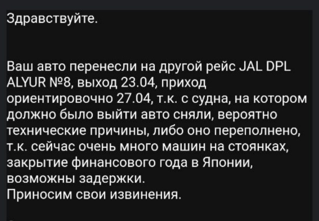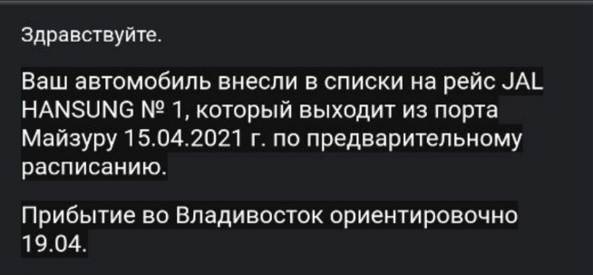 Всё супер. Машинку получили. Ребята молодцы отработали на все 100. По приезду машины во Владик - выполнили все мои пожелания. Колеса, ТО, потолочный монитор и много ещё. На отправке неделю в очереди на автовоз и через 11 дней в Москве. Отмыли и чудо космолёт радует.