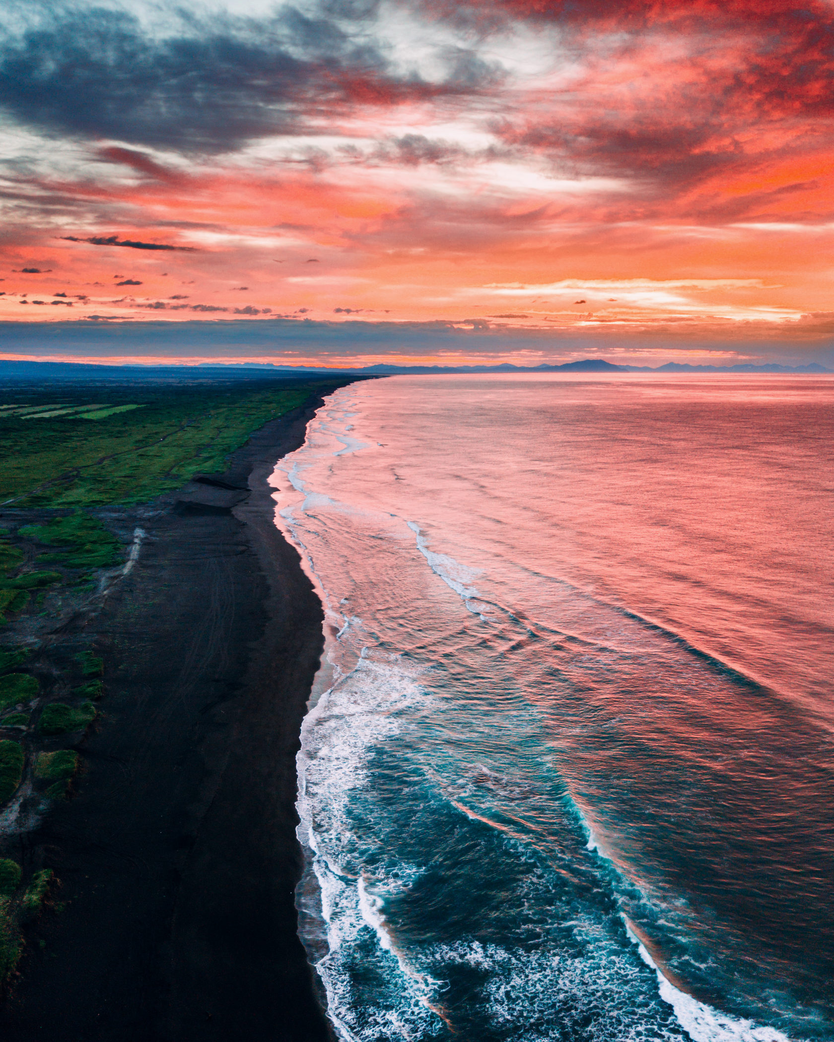 Халактырский пляж с черным вулканическим песком протянулся на многие километры вдоль берега Тихого океана. Воздух здесь холодный и соленый, а сочетание черного и зеленого цветов создает невероятные пейзажи.