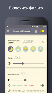 Одно из наиболее гибких приложений, которое позволяет настроить не только фильтр синего, но также затемнение экрана и цветовую температуру. Активировать режим защиты можно с учётом времени восхода и заката.