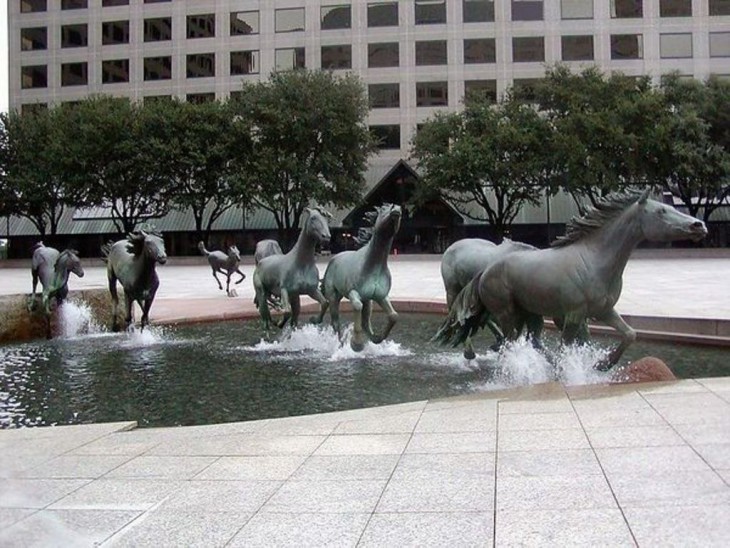 Это самая большая в мире скульптурная композиция, изображающая лошадей. Скульптор запечатлел мустангов, бегущих по воде, и они примерно в полтора раза больше, чем реальные животные. Эти дикие лошади долгое время водились в Техасе, это своеобразный символ Техаса в период его освоения: движущая сила и раскрепощенный дух были ему присущи.