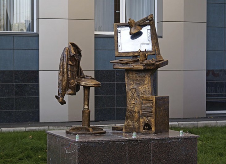 Памятник представляет собой рабочее место дизайнера-полиграфиста: стол, стул, компьютер, настольная лампа и даже куртка — нет только самого дизайнера-полиграфиста.